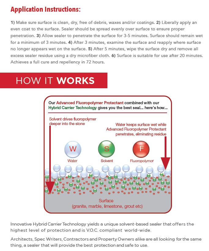 Features our Advanced Fluoropolymer Protect and Hybrid Carrier Technology. We have developed a solvent based sealer that is VOC compliant, non-flammable and safe for food preparation surfaces.
